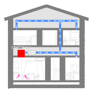 空気がよどむと微小粒子やカビ菌が蓄積され、お家にも健康にも良くありません。1台の電子式集塵フィルタで清浄化された空気をお家全体にゆっくり循環させ、家じゅうを空気清浄します。